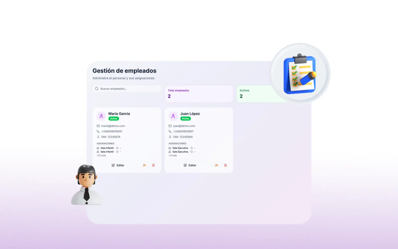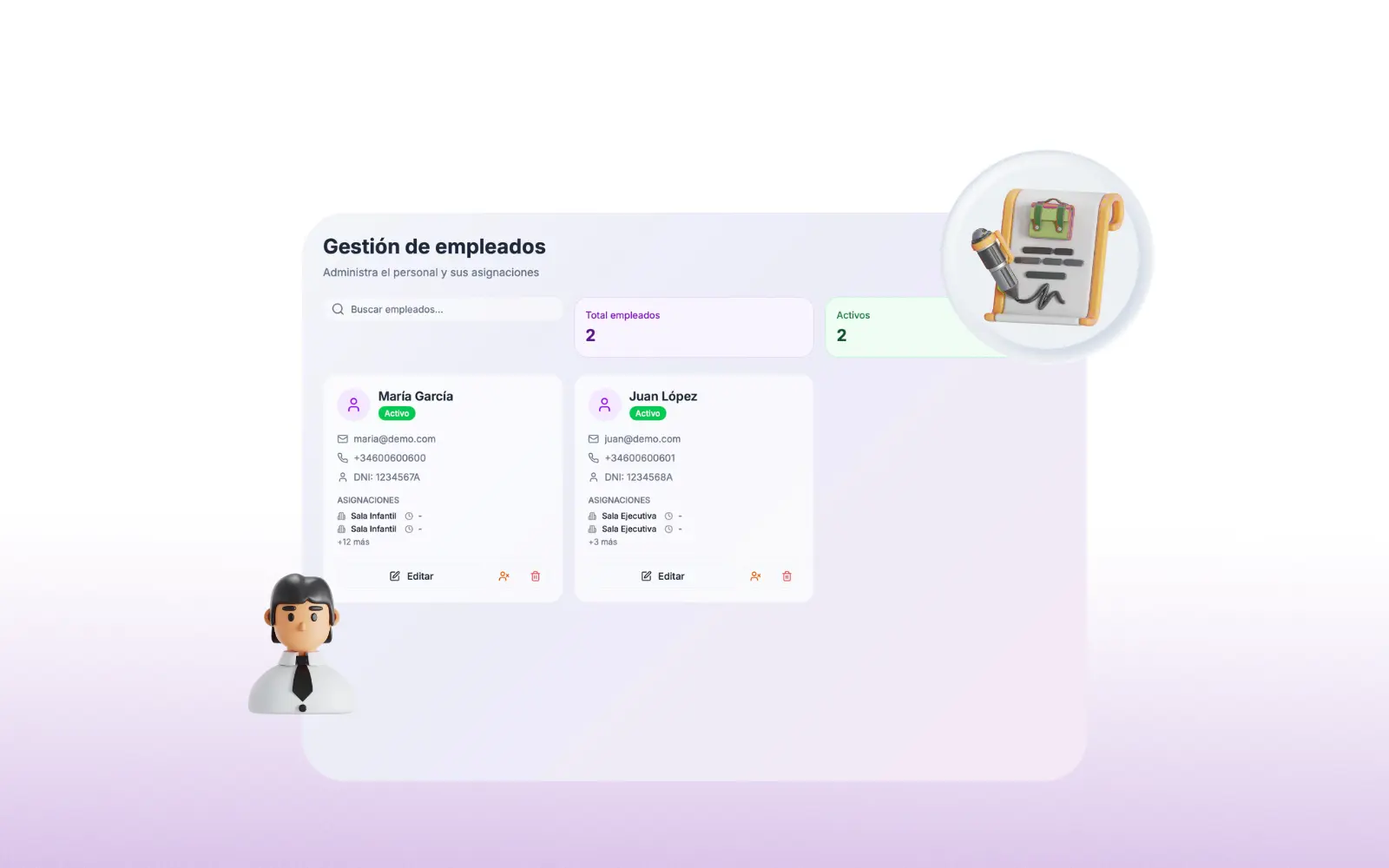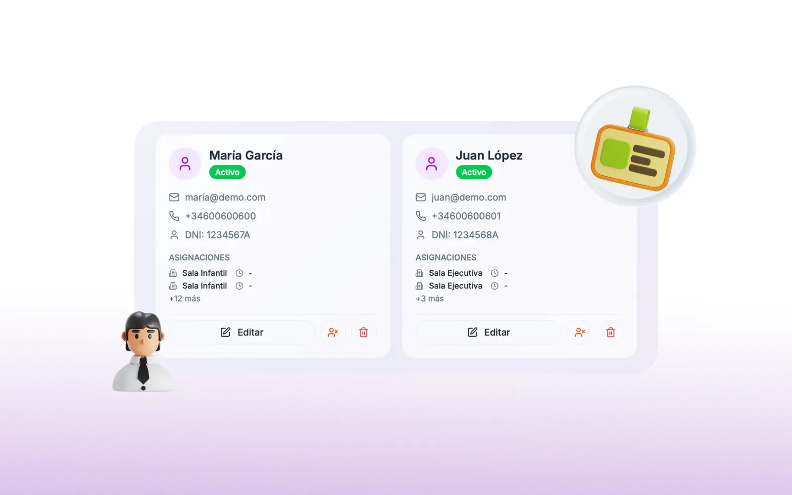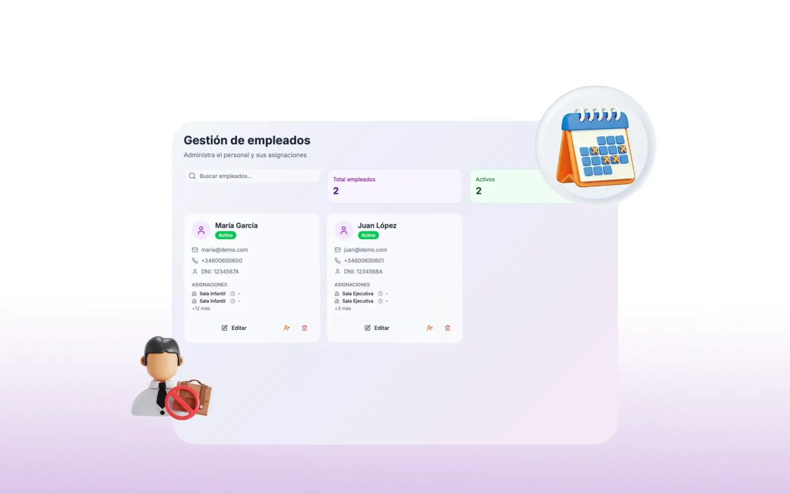 Decide en qué salas trabaja cada empleado. Solo verá y gestionará reservas de esas salas.