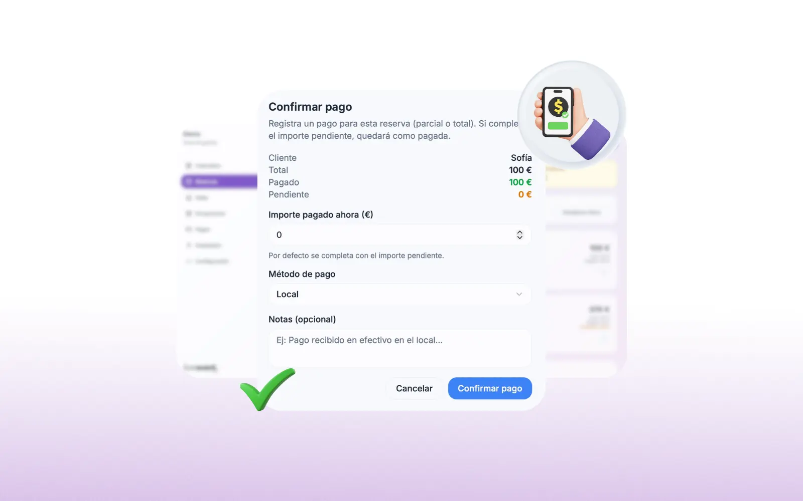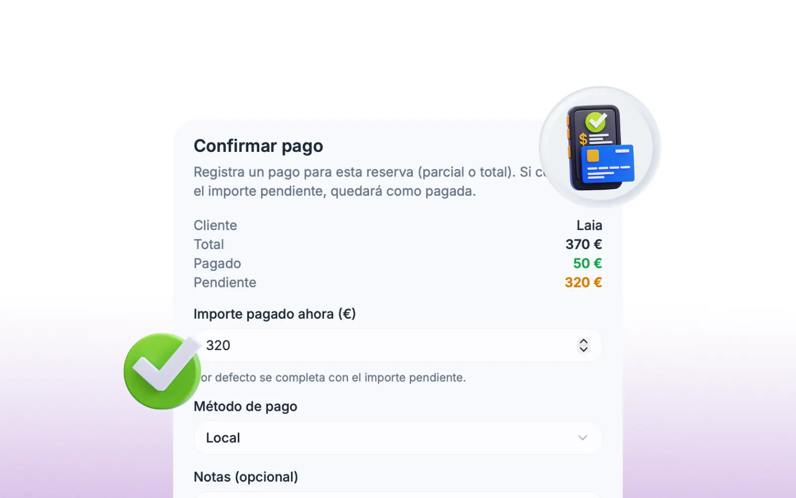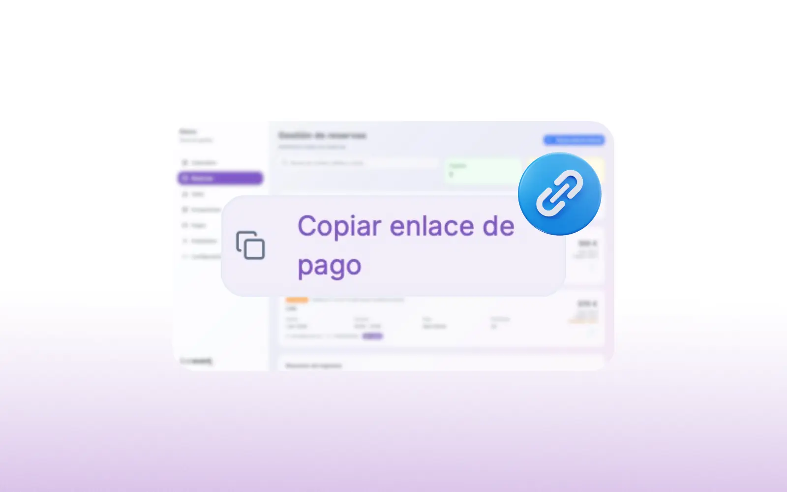 Crea la reserva, envia el enlace en un clic y cobra sin llamadas ni transferencias: el cliente solo paga y listo.