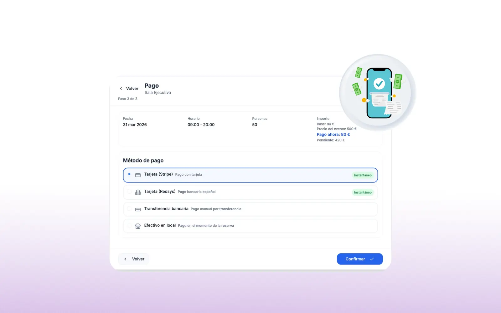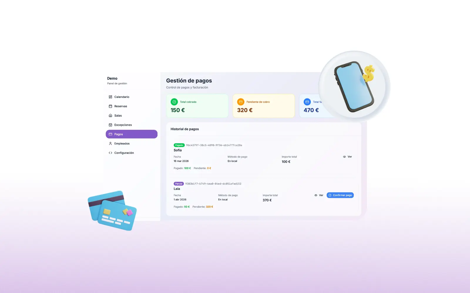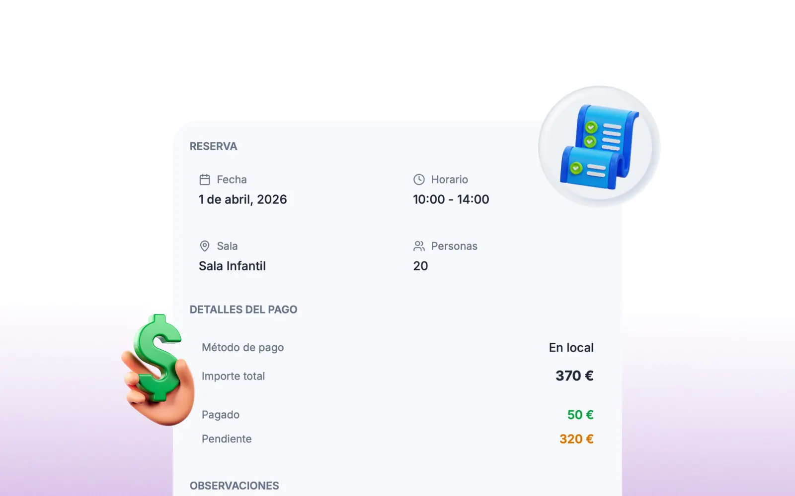 Crea la reserva, envia el enlace en un clic y cobra sin llamadas ni transferencias: el cliente solo paga y listo.