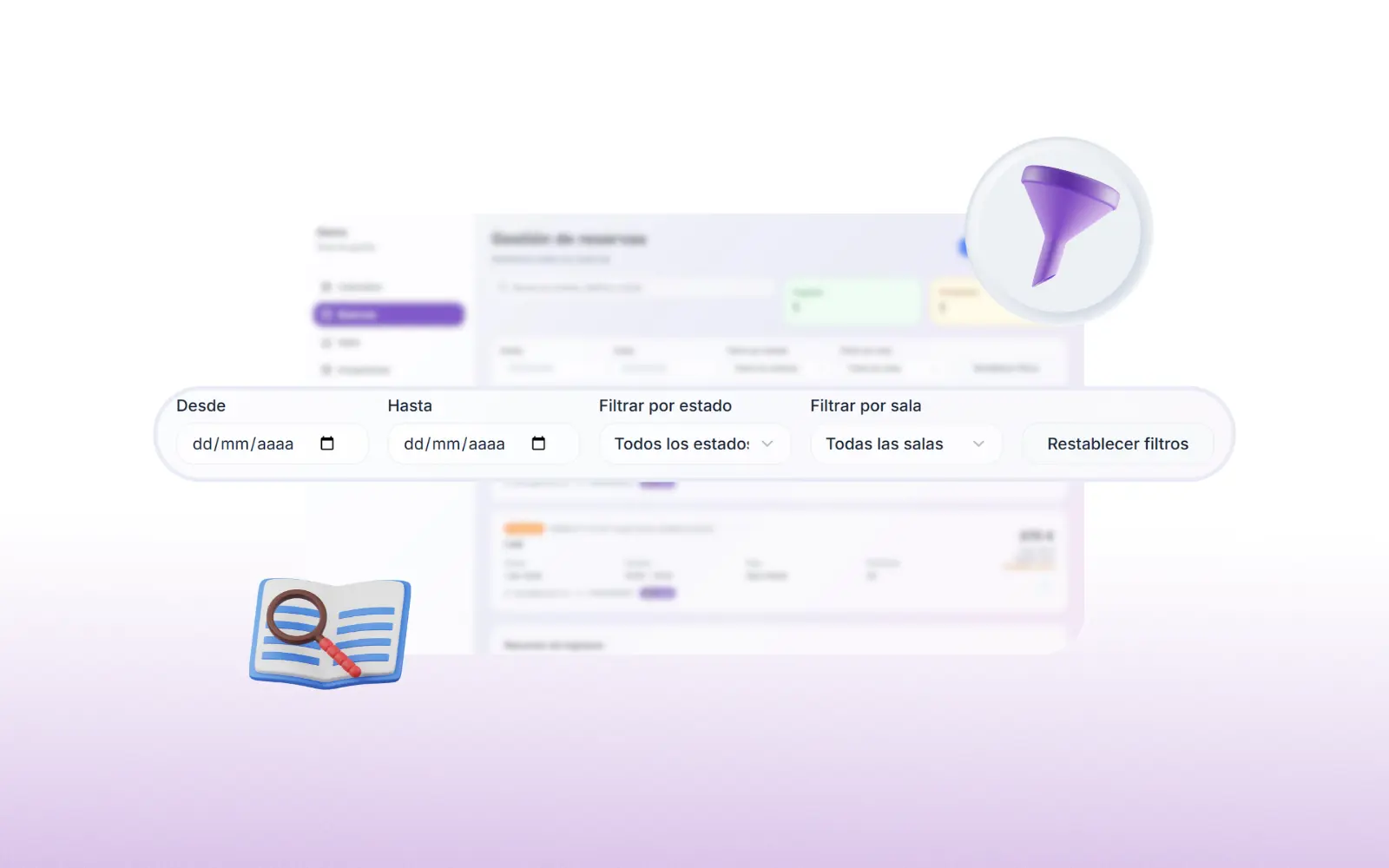 Filtra por fechas, estado y sala, y restablece con un clic.