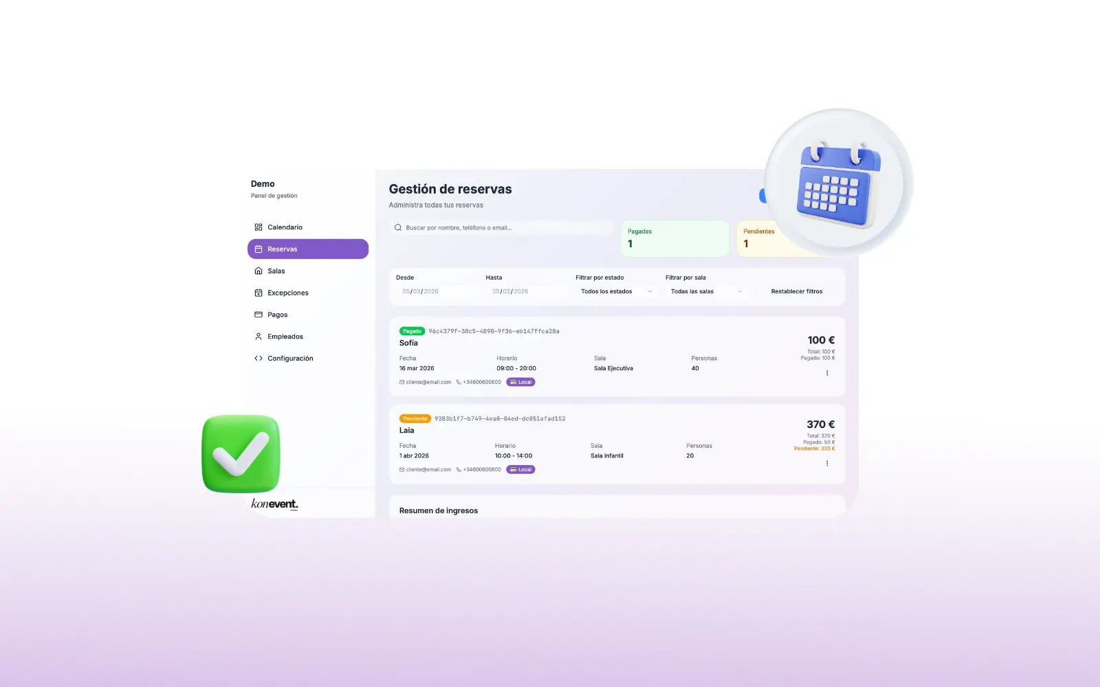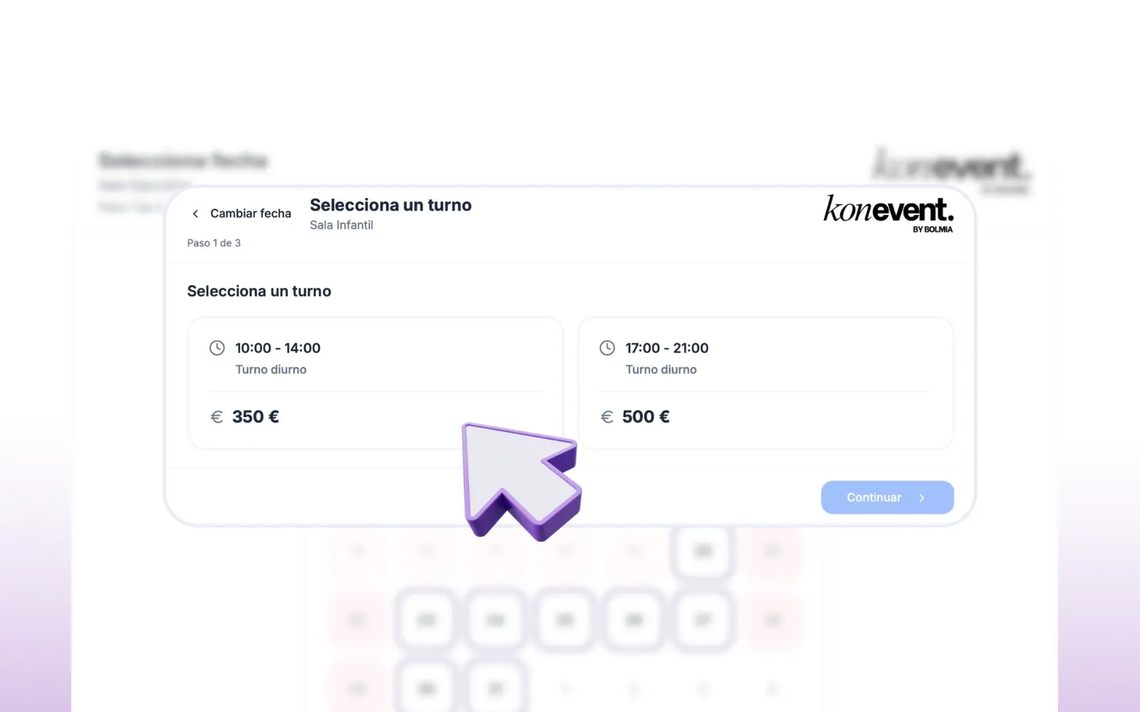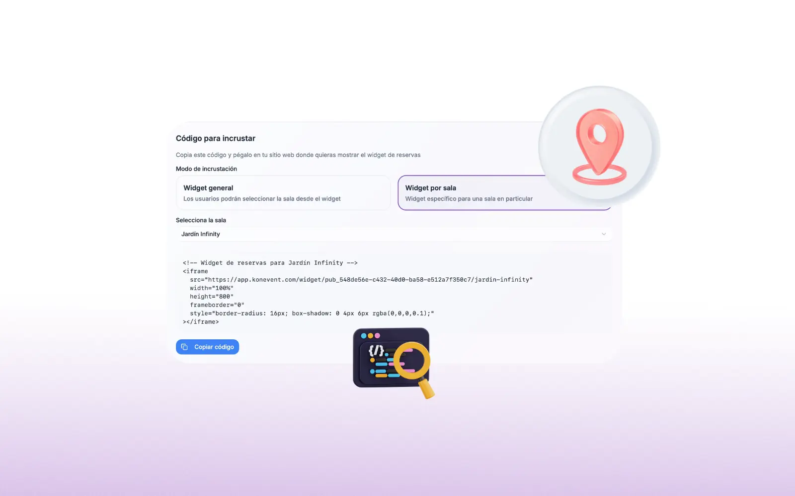 Explora todo lo que puedes hacer con Konevent: salas, reservas, turnos, precios, pagos y un widget de reserva para tu web.