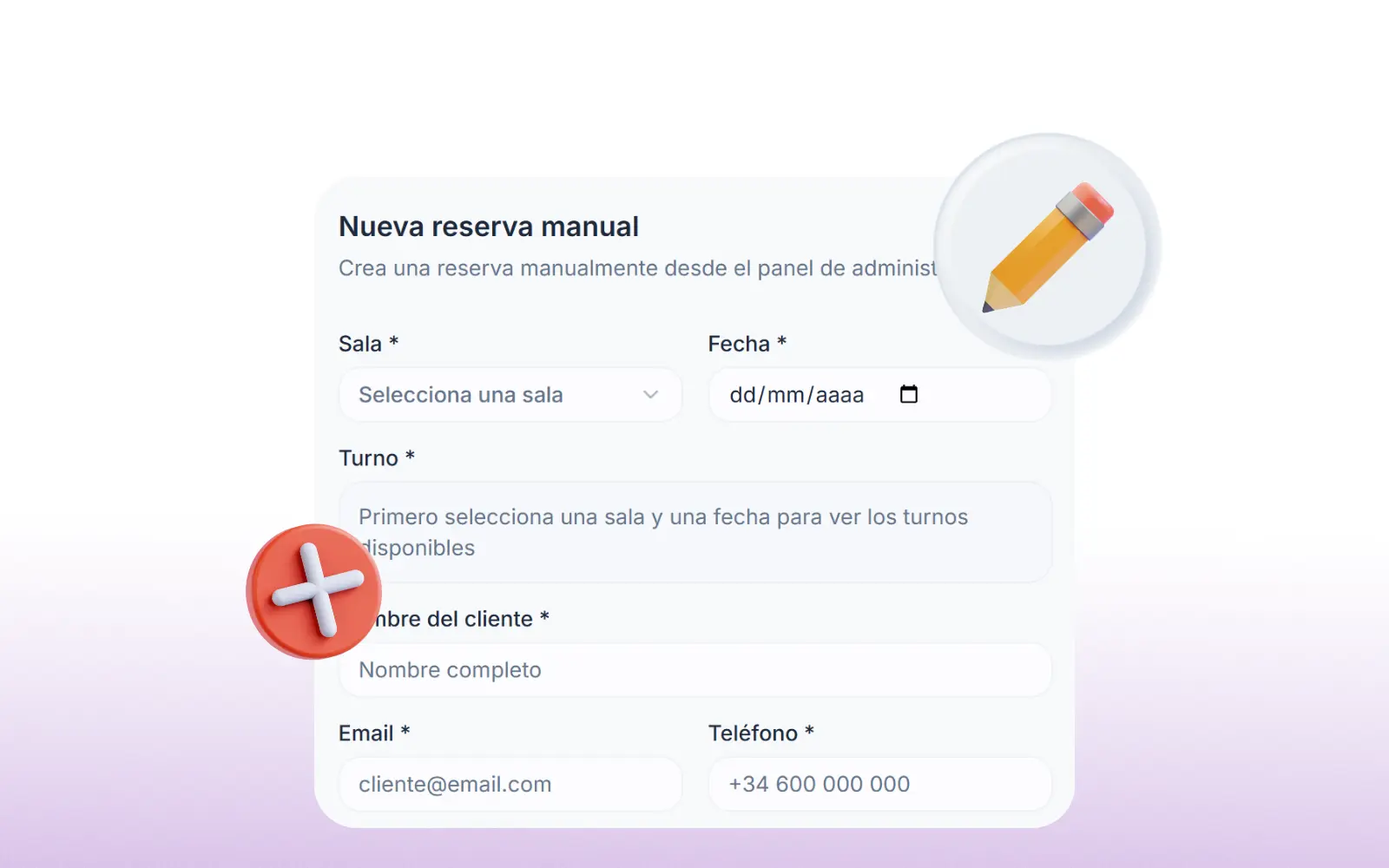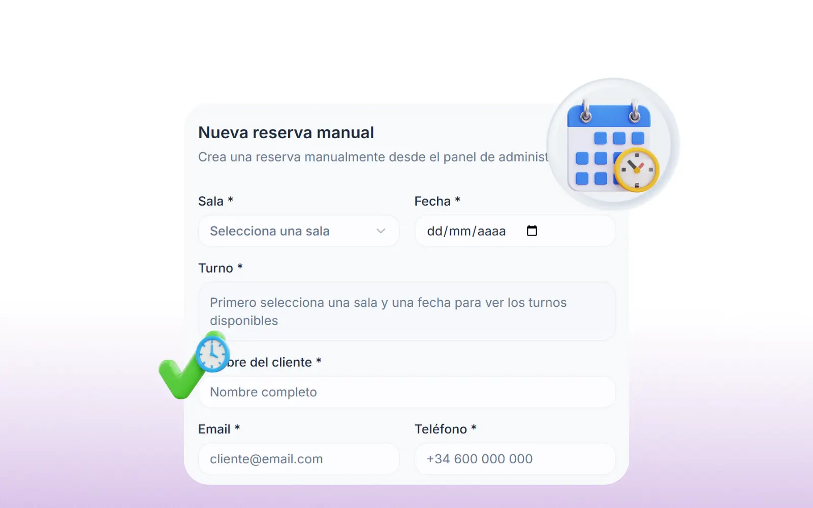 Crea reservas desde el panel (ideal para teléfono/WhatsApp).