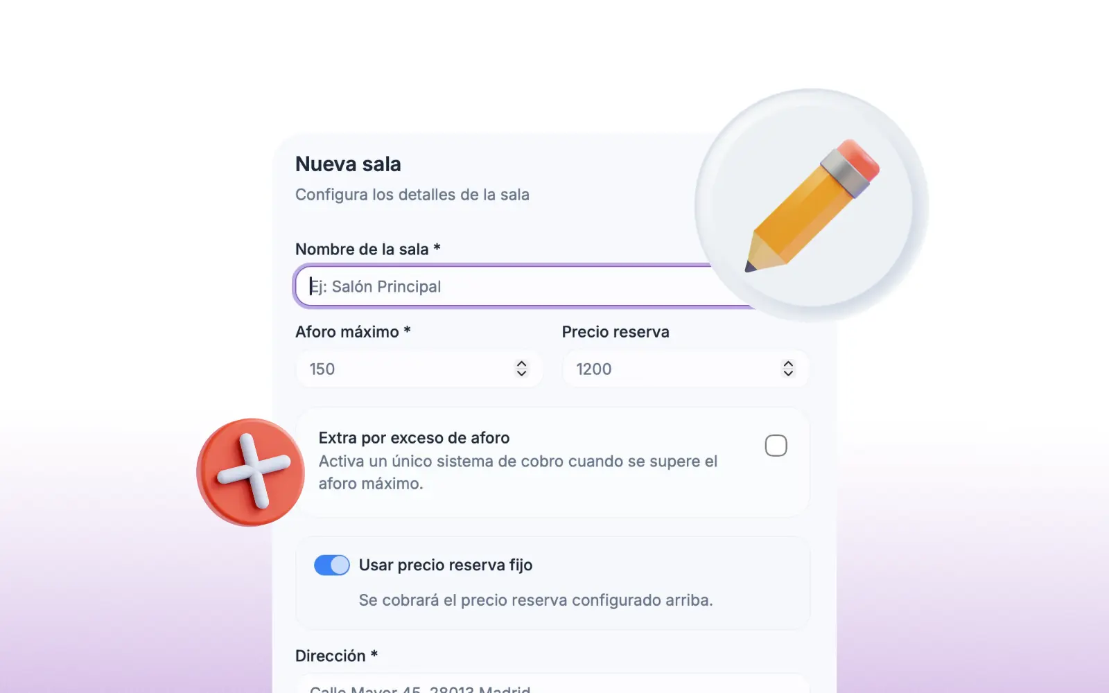 Configura nombre, aforo, dirección, precio de reserva y notas.