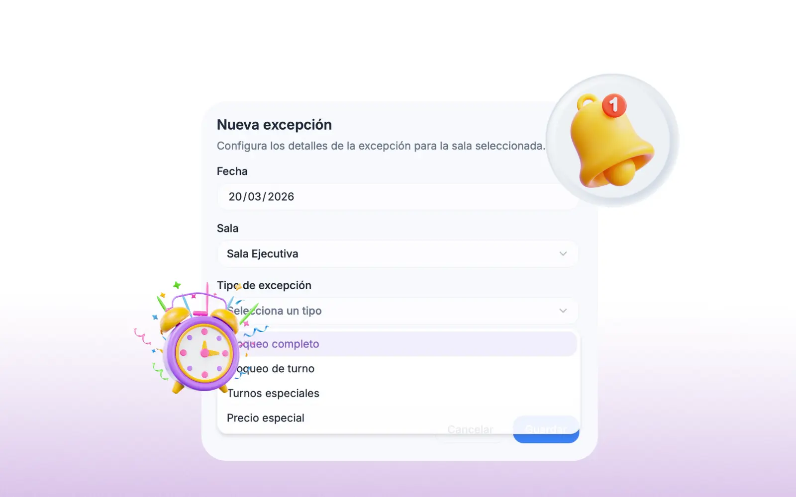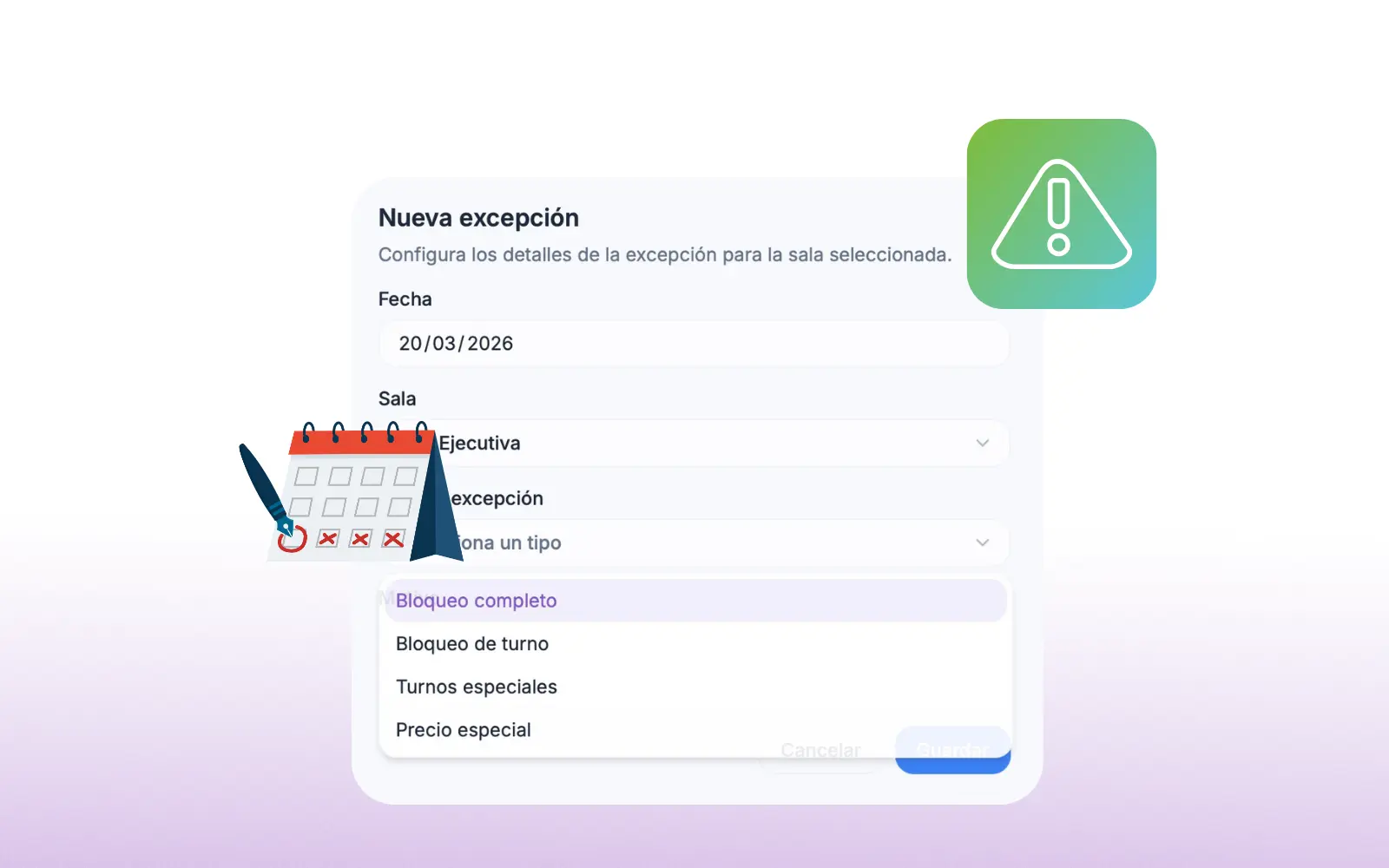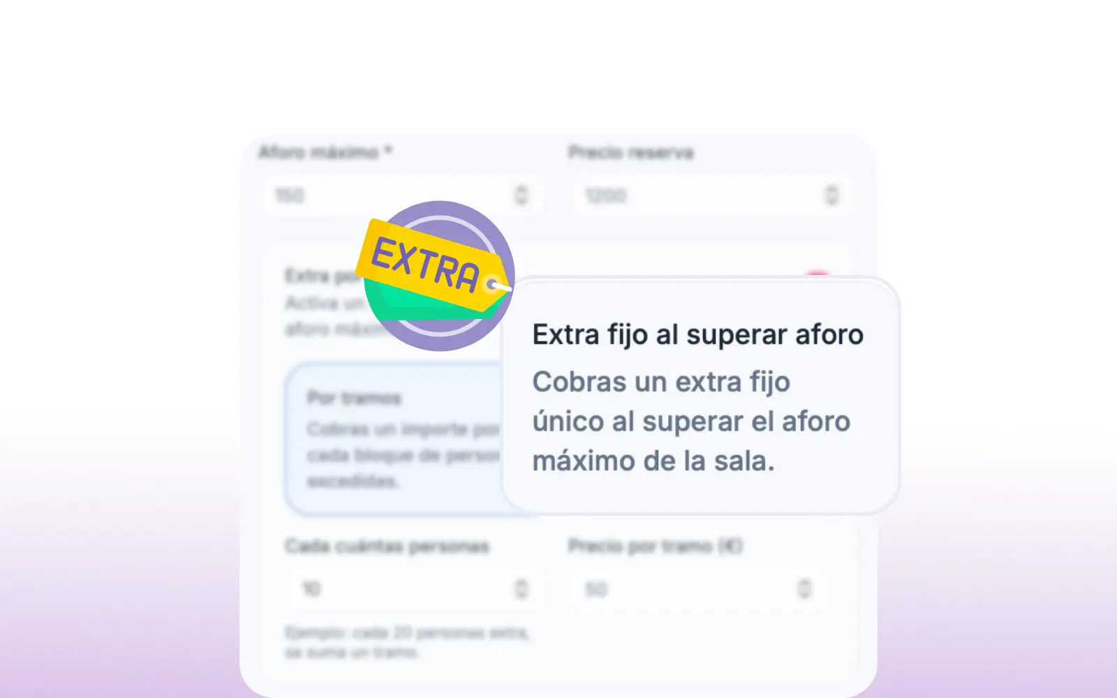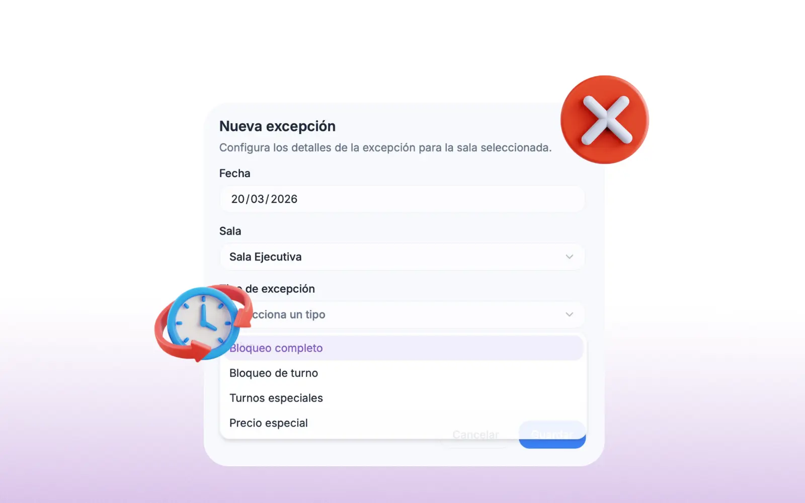 Adapta cada sala a tu modelo real de negocio: exclusiva clásica, por plazas o mixta.