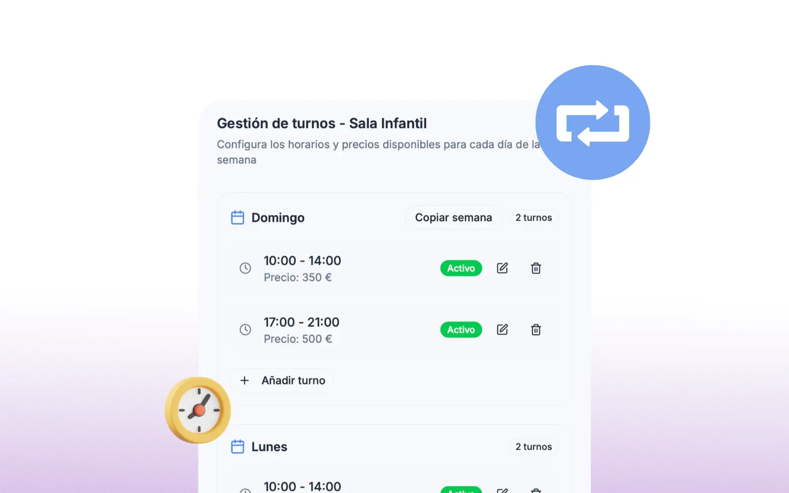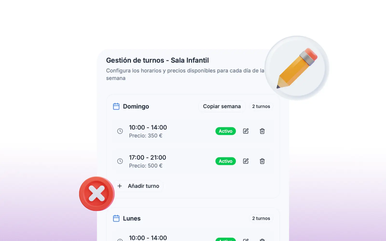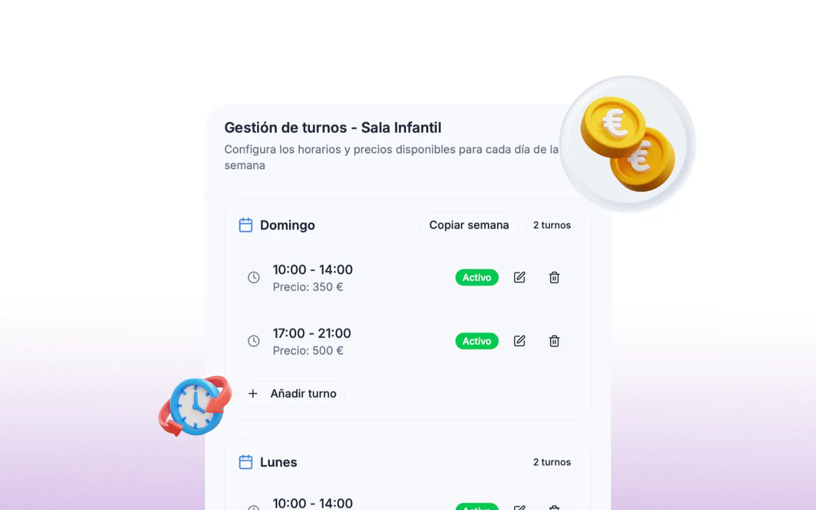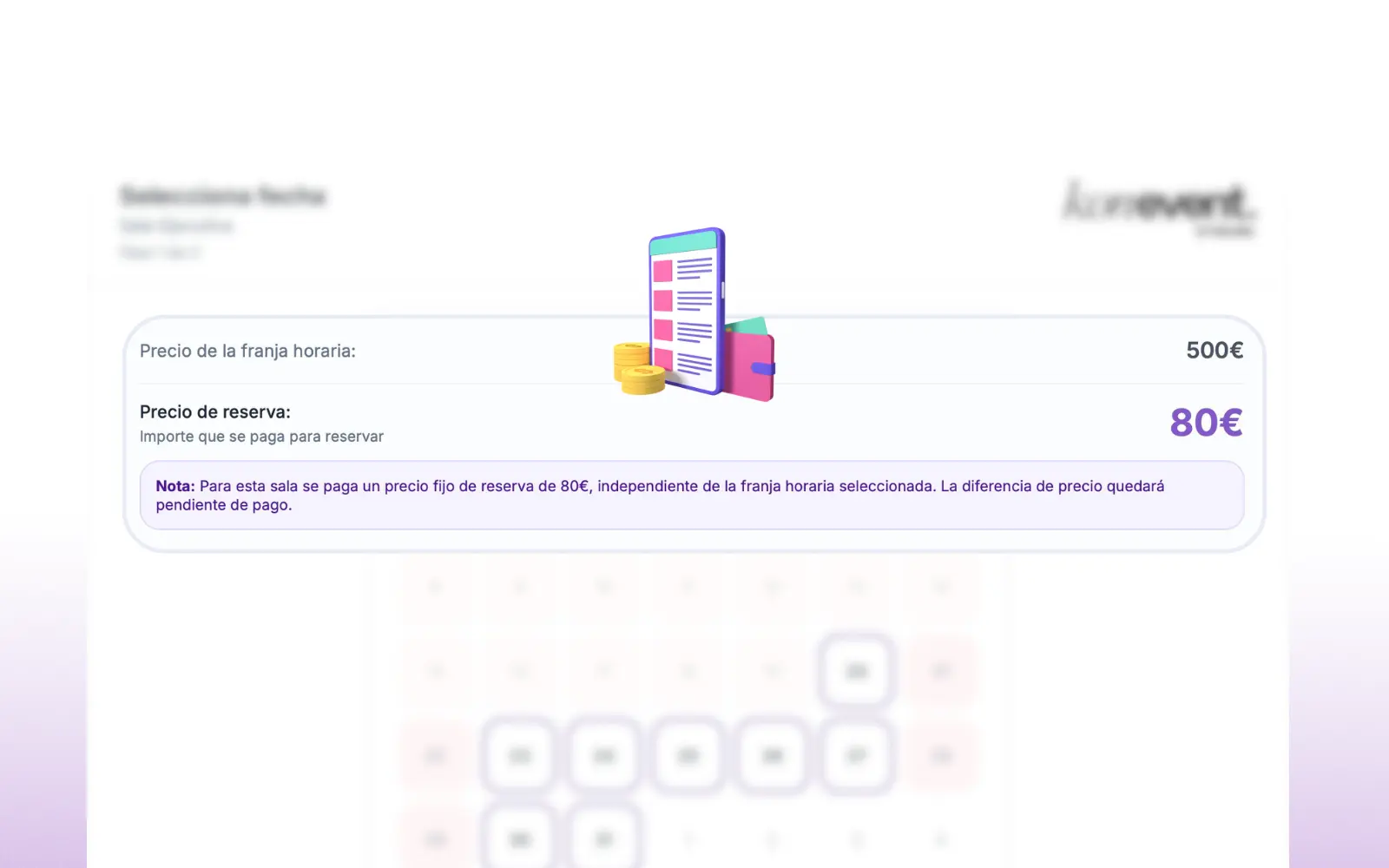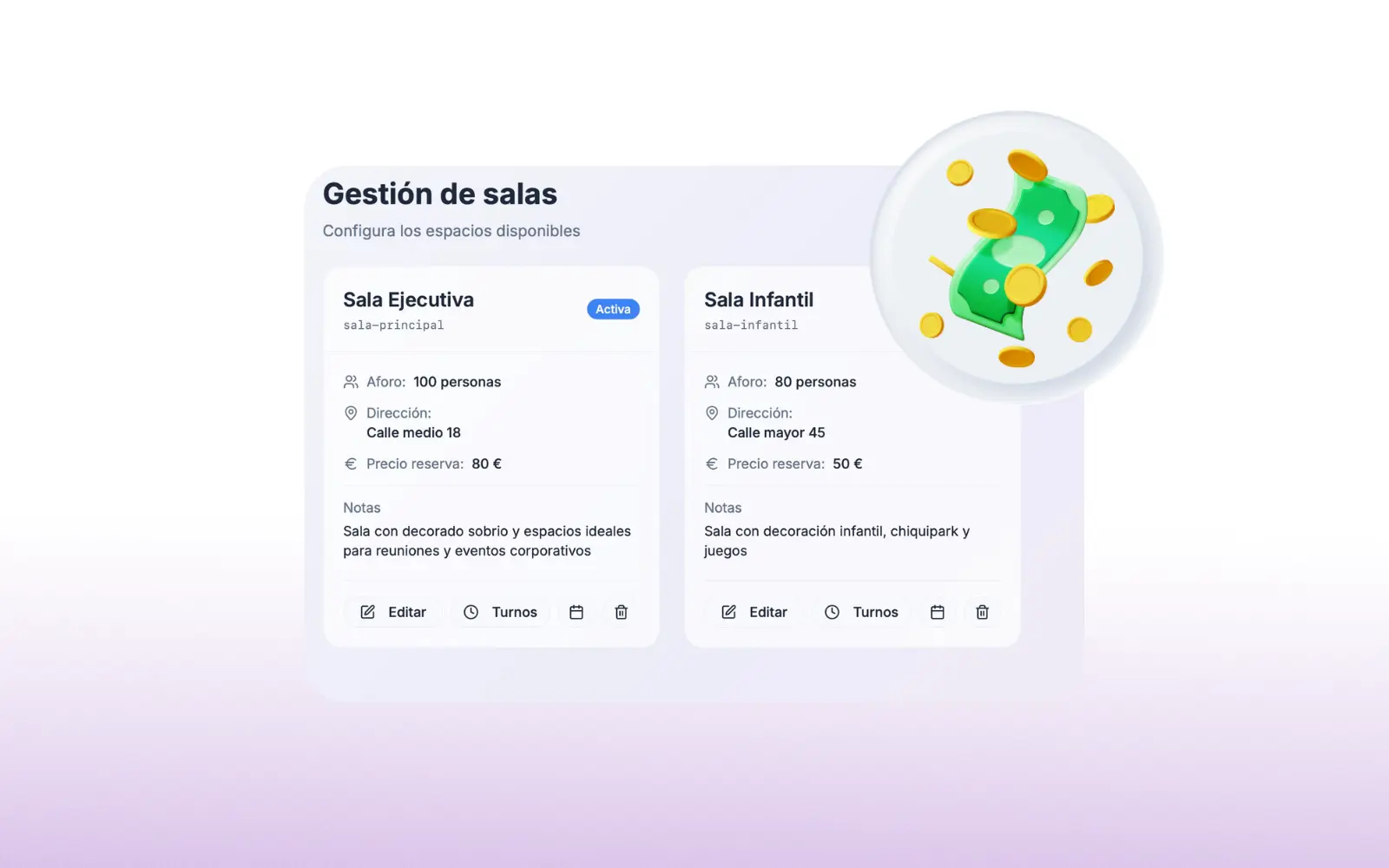 Define el importe por hora de cada sala y deja que el sistema calcule el total según la duración elegida.