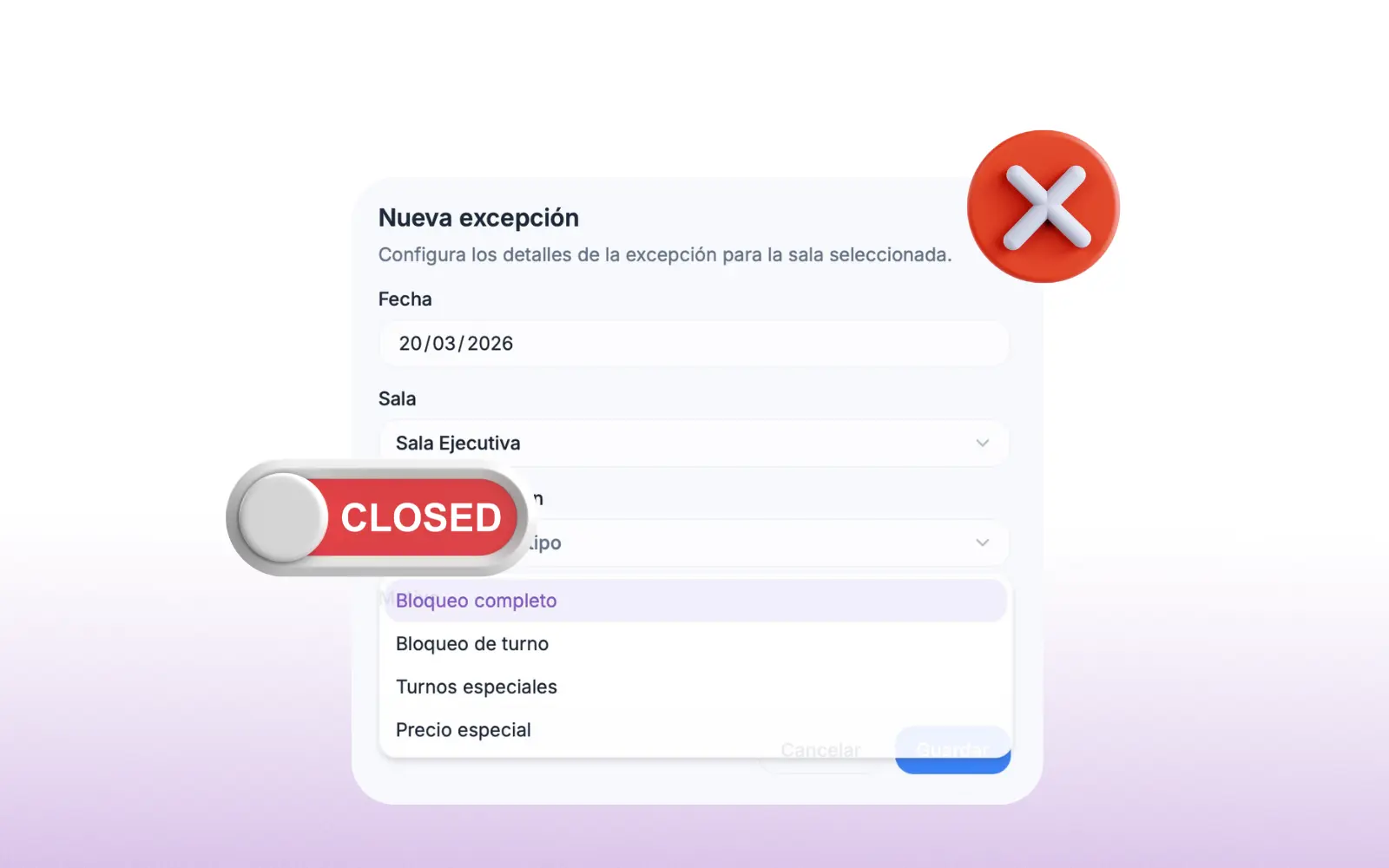Cierra una fecha entera para una sala cuando no quieras admitir reservas.