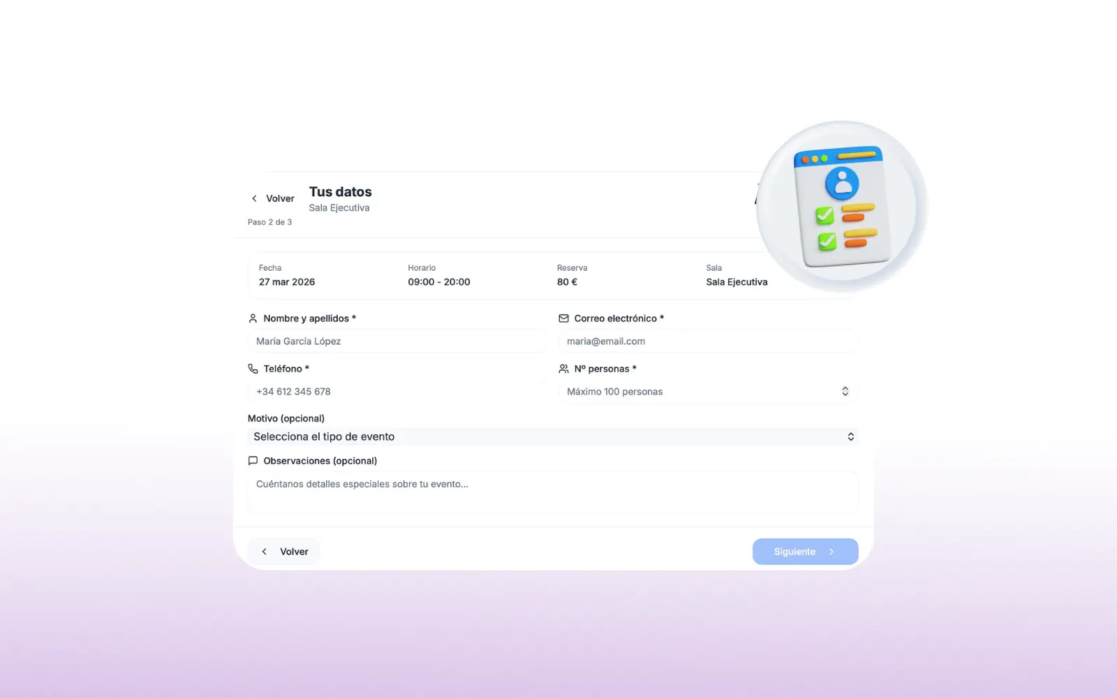 Nombre, email, teléfono, nº personas y detalles del evento.