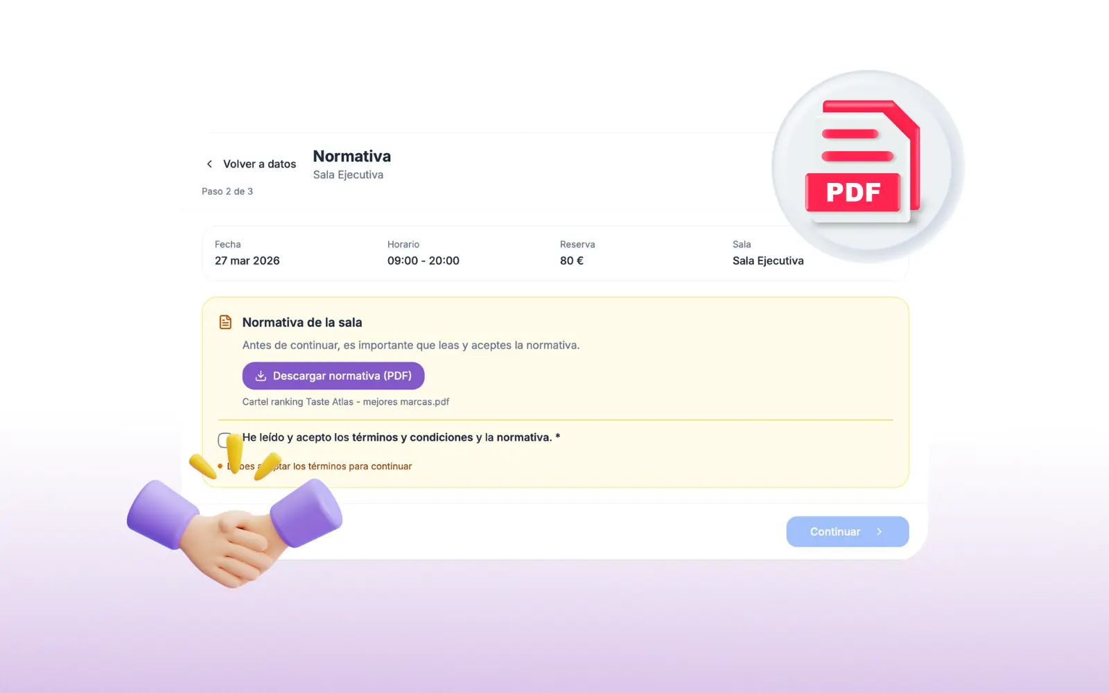 Muestra texto obligatorio o un PDF antes de finalizar la reserva.